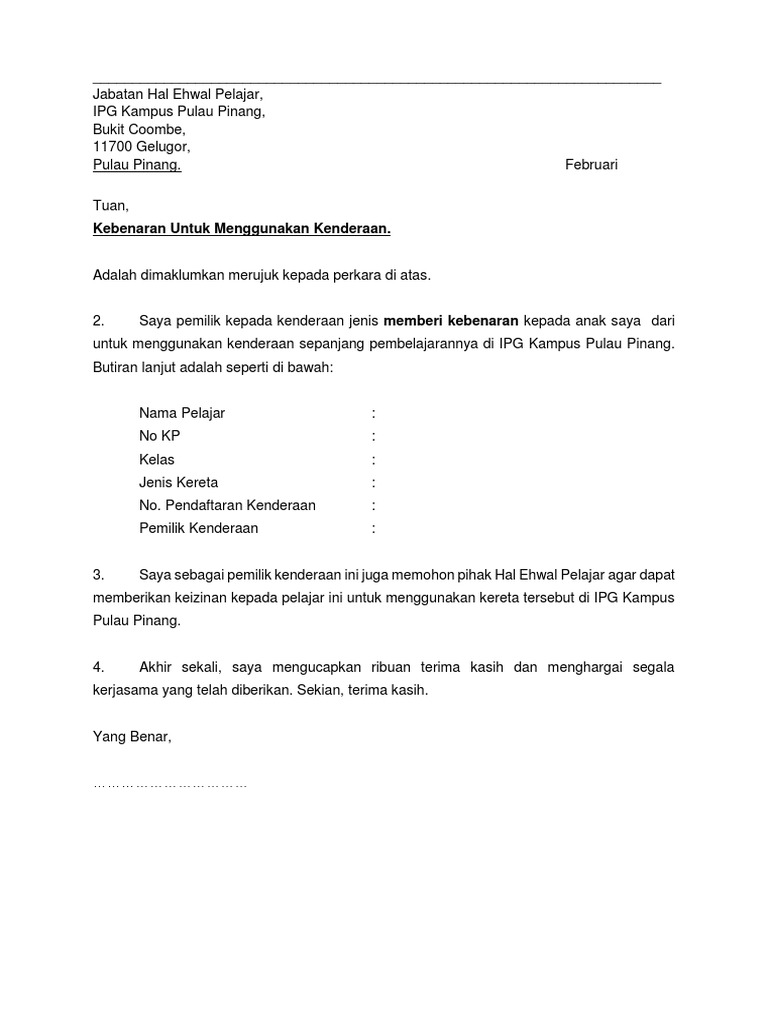 TuanPuan SURAT KEBENARAN MENGGUNAKAN RUANG PEJABAT. Surat ini juga boleh digunakan untuk memberi kebenaran seperti kebenaran memasuki kawasan kebenaran. Contoh Surat Kebenaran Pemilik Kenderaan Kumpulan Contoh Terbaru.